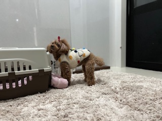 環境が変わって不安かもしれないのでお部屋にゲージを置いてあります。