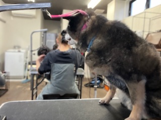 トリミング台に乗ったのも初めてなのかかなり隅っこに😅