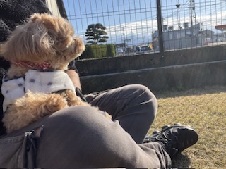 スタッフのお膝にぴょんと飛び乗り
