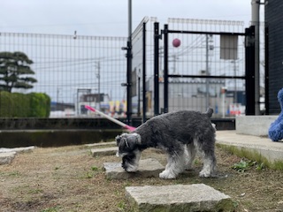 駐車場の方を見るしゅしゅ丸ちゃん。