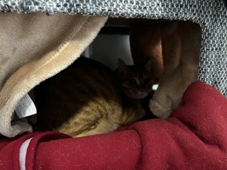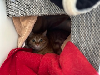 お昼もキャットタワーに隠れるいちごちゃん。。
